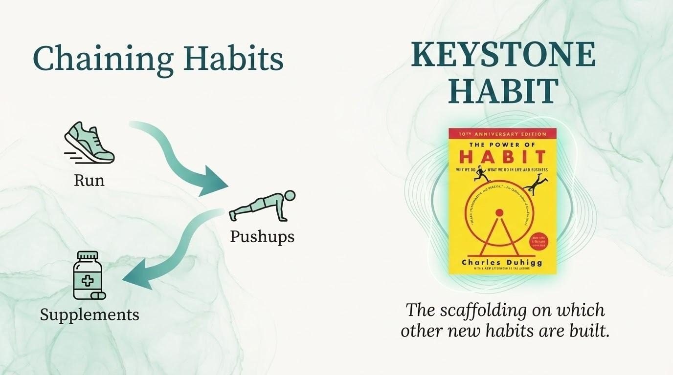 I used the running habit as the cue for the pushup habit. The reward for my run – my coffee — became the cue for another habit, because I keep the supplements right next to the coffee. Within 6 months, a singular habit became a habit chain: a morning run → pushups → supplements.