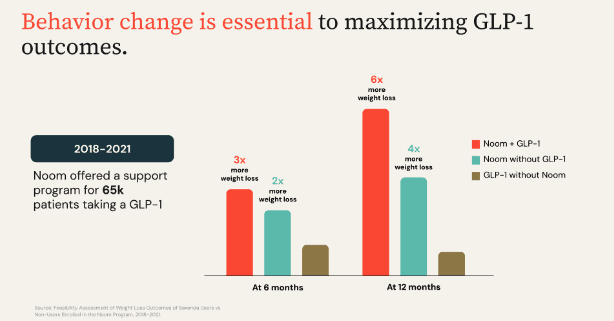 At Noom, we know that many people will receive GLP-1s and other anti-obesity medications through their doctor or another source. For those people, Noom’s beloved weight loss program, Noom Weight, is the perfect companion. Noom Weight helps users with all levels of weight loss goals to connect deeply with their own ‘why’ for better health, understand their relationships with food, learn valuable tips to manage stress, track their progress in a variety of ways, stay accountable, and ultimately, lose weight and keep it off through our best-in-class psychological approach. Noom Weight has been used by millions of people across the spectrum of weight acuity because it easily integrates into the lives of our users and produces real results.