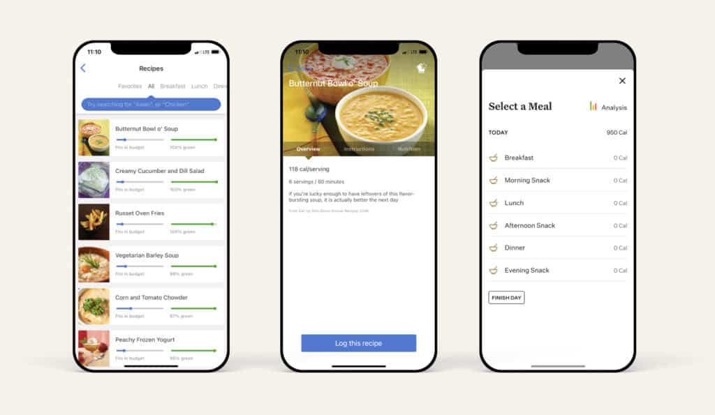 There’s over 6000 recipes on the WW app, and a weekly planning template that allows users to search the database for items, recipes, or whole recommended plans and apply them to an upcoming weekday.