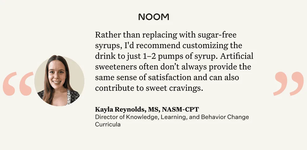 You can cut down on the total sugar and calories by selecting drinks made with sugar-free syrups, but Reynolds doesn’t suggest it: “Rather than replacing with sugar-free syrups, I’d recommend customizing the drink to just 1 to 2 pumps of syrup. Then, you can add flavorful spices like cinnamon and nutmeg at the counter. That way, you’re actually cutting down on sugar instead of swapping it for artificial sweeteners, which often don’t always provide the same sense of satisfaction and can also contribute to sweet cravings. Over time, this can help retrain your taste buds to enjoy less sweetness while still keeping your drink enjoyable.”