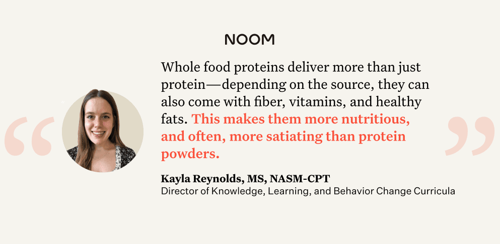 “Whole food proteins deliver more than just protein—depending on the source, they can also come with fiber, vitamins, and healthy fats. This makes them more nutritious, and often, more satiating,” she explains. “That said, protein powder isn’t bad. They can be more convenient post-exercise or on days when you’re not very hungry.”