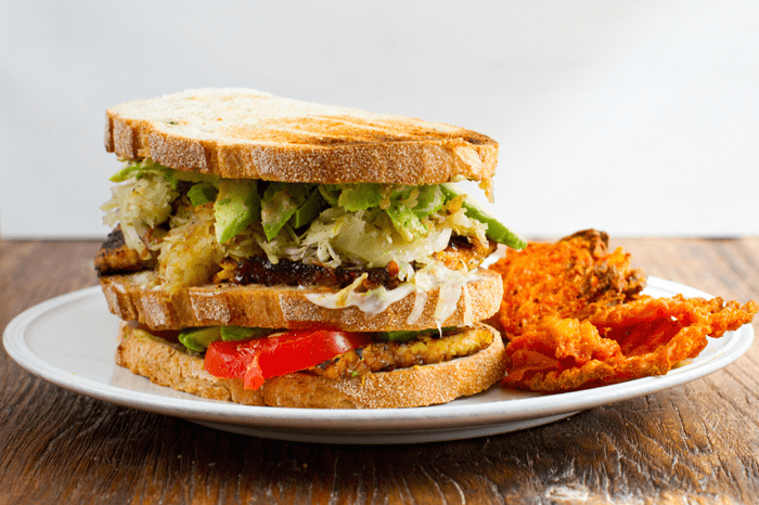 Craving a BLT without the B? This reuben-style sandwich from the Lunch Box Bunch has you covered. Tempeh is a soy product that is similar to tofu, but less processed. It gives a bite just as satisfying as your normal lunch meat.