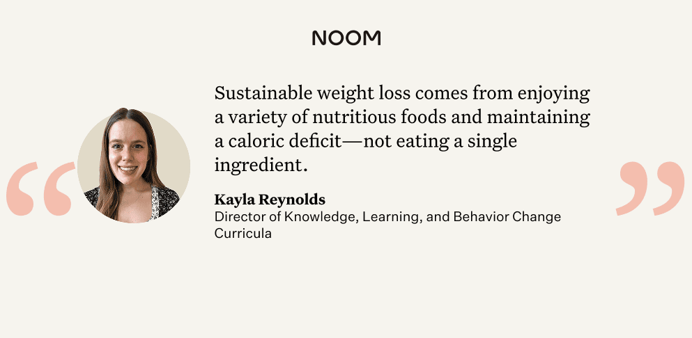 “Sustainable weight loss comes from enjoying a variety of nutritious foods and maintaining a caloric deficit—not eating a single ingredient,” says Kayla Reynolds, NASM, CPT, Director of Knowledge, Learning, & Behavior at Noom.