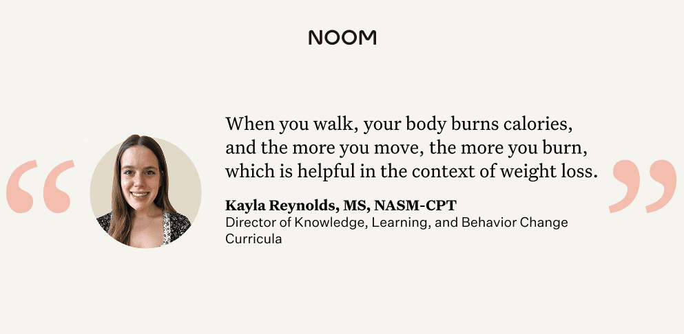 Kayla Reynolds, MS, NASM Certified Professional Trainer, Noom’s Director of Knowledge, Learning, & Behavior Change Curricula, is a big fan of walking. “The simplicity and accessibility of walking make it a powerful tool for increasing activity level,” she says. “It’s a form of movement that many people can integrate into their daily lives and make a habit.”