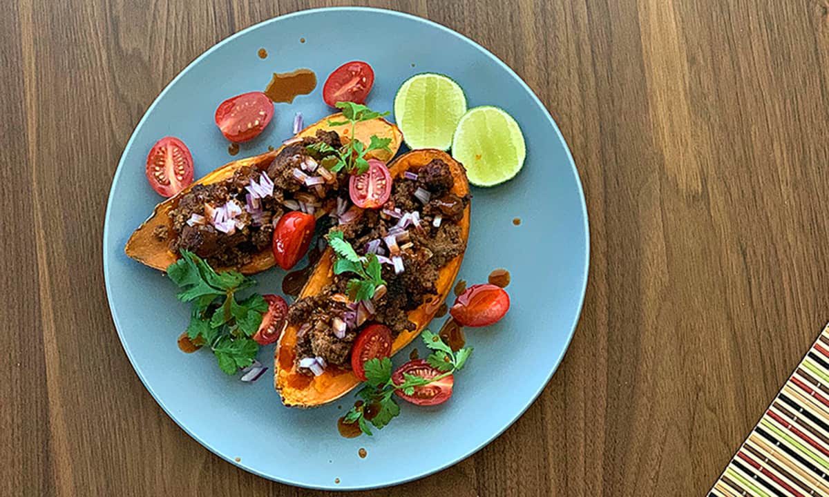 - Saca la batata del horno y con una cuchara saca un poco de la pulpa (para hacer un pequeño bote), coloca la carne en el centro, agrega los tomates cherry, cilantro picado y la salsa chipotle. Acompaña con unas rodajas de limón y ¡disfruta!