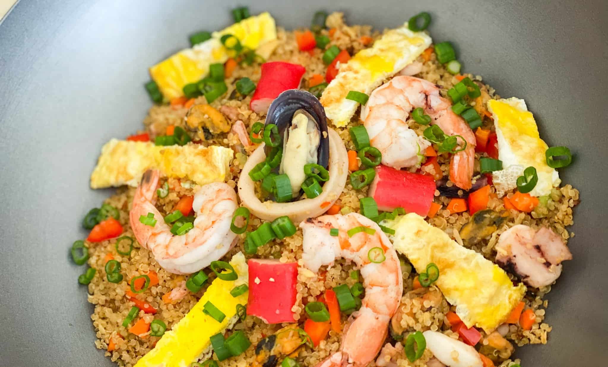 - Incorpora la quinoa cocida y revuelve bien hasta que esté caliente. Rocía con la salsa de soja y la cucharada de aceite de ajonjolí, finalmente, agrega los mariscos y el huevo picado