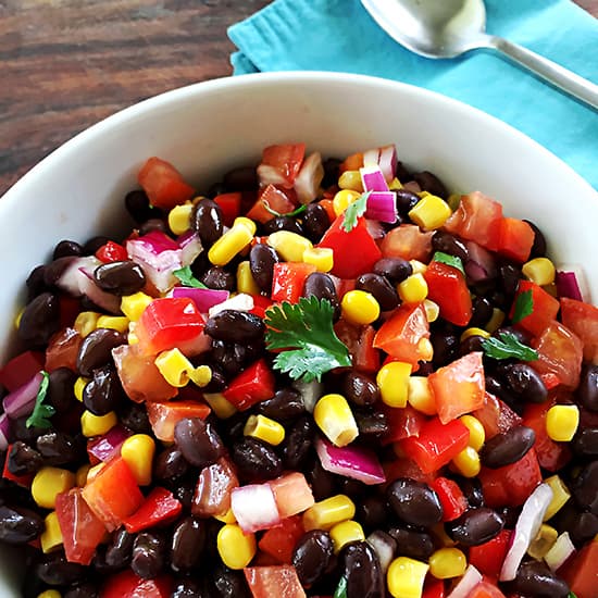 - Combina y mezcla en un bol, los frijoles negros, el maíz, el tomate, la cebolla, el pimiento rojo, el ajo y el cilantro.